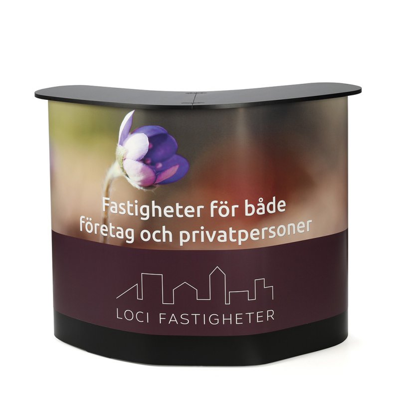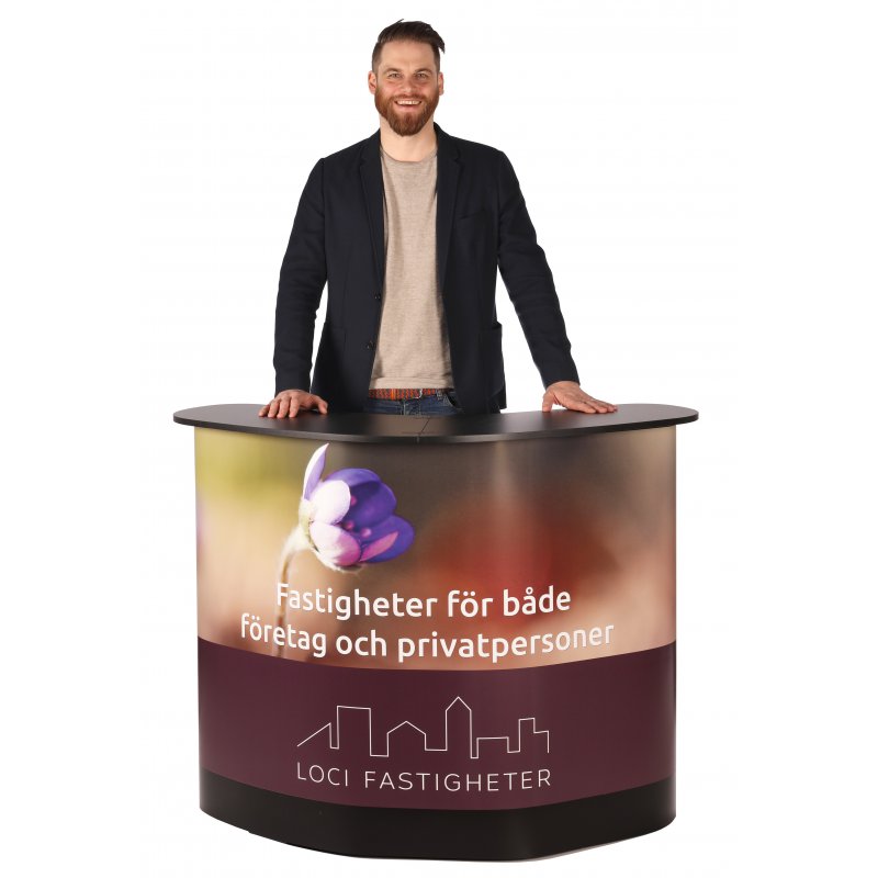 Messebordet leveres komplett med en svart toppplate, fire hyller og et trykt budskap, noe som gir deg en komplett løsning for dine behov på messer og eventer.
