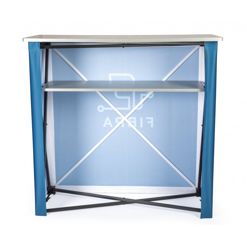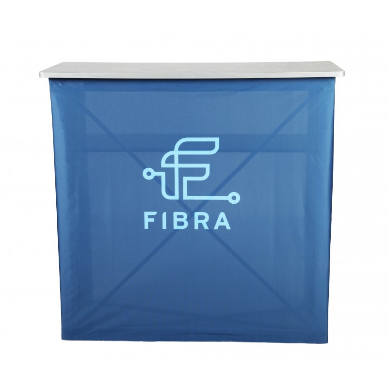 Et moderne messebord med tekstil som gir et helhetlig uttrykk sammen med veggen. Perfekt som møtepunkt og for produktpresentasjon.